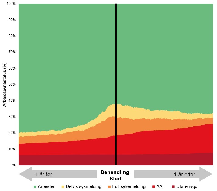Norway ranks at the very top among the OECD countries when it comes to absence due to illness and disability benefit. However, little is known about how capacity for work changes before and after treatment for mental health problems.