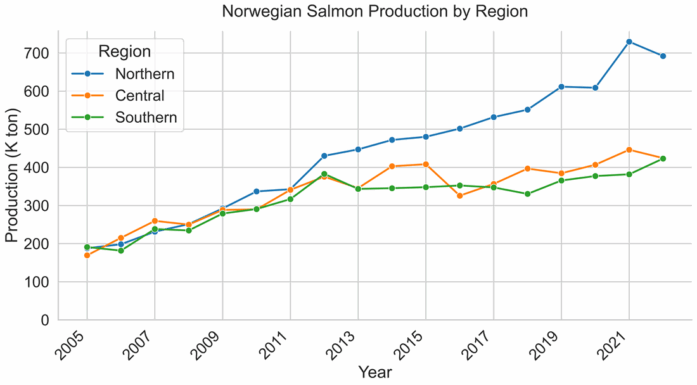 Annual production of Norwegian salmon farming in pens in the southern, central, and northern regions from 2005 to 2022. The regions are defined as follows: the northern region includes Troms, Finnmark, and Nordland; the central region includes Trøndelag and Møre og Romsdal; and the southern region includes Vestland, Rogaland, and Agder. Data from the Norwegian Directorate of Fisheries. Illustration: Chun-Deng Wang, NTNU