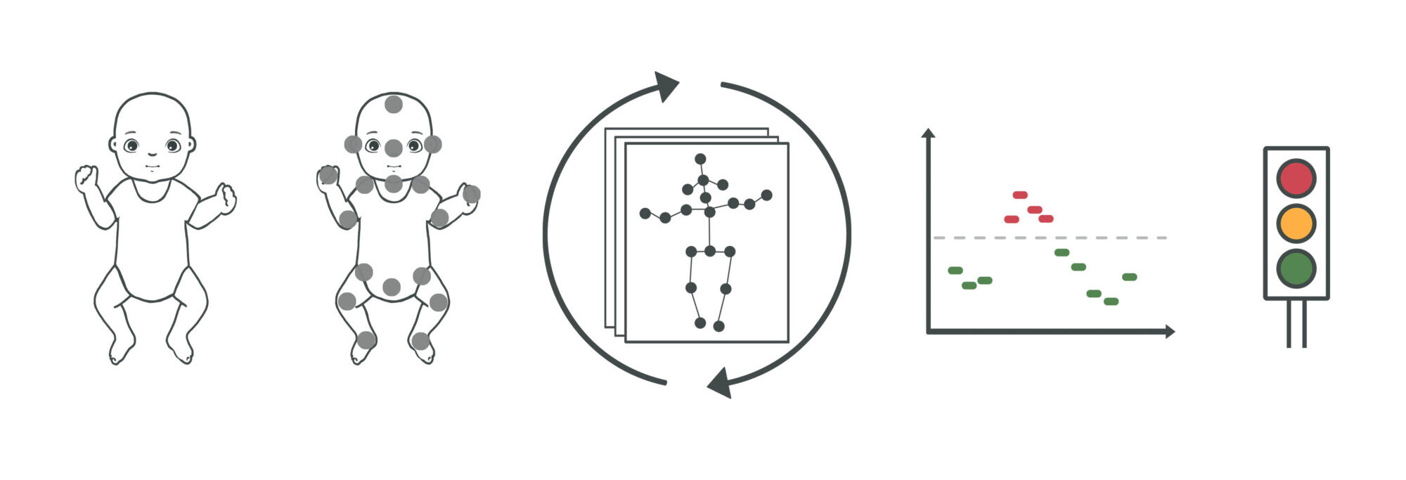 This illustration shows how the entire In-Motion Technologies AI tool works. From left: an infant lies on its back and is filmed by its parents. The video is processed by computer which identifies the 19 important body parts in the video. The In-Motion Technologies AI tool assesses the infant’s movements and assigns a risk of cerebral palsy for every five seconds of video, which a doctor can review simultaneously while viewing the video. Illustration: The NTNU In-Motion Project