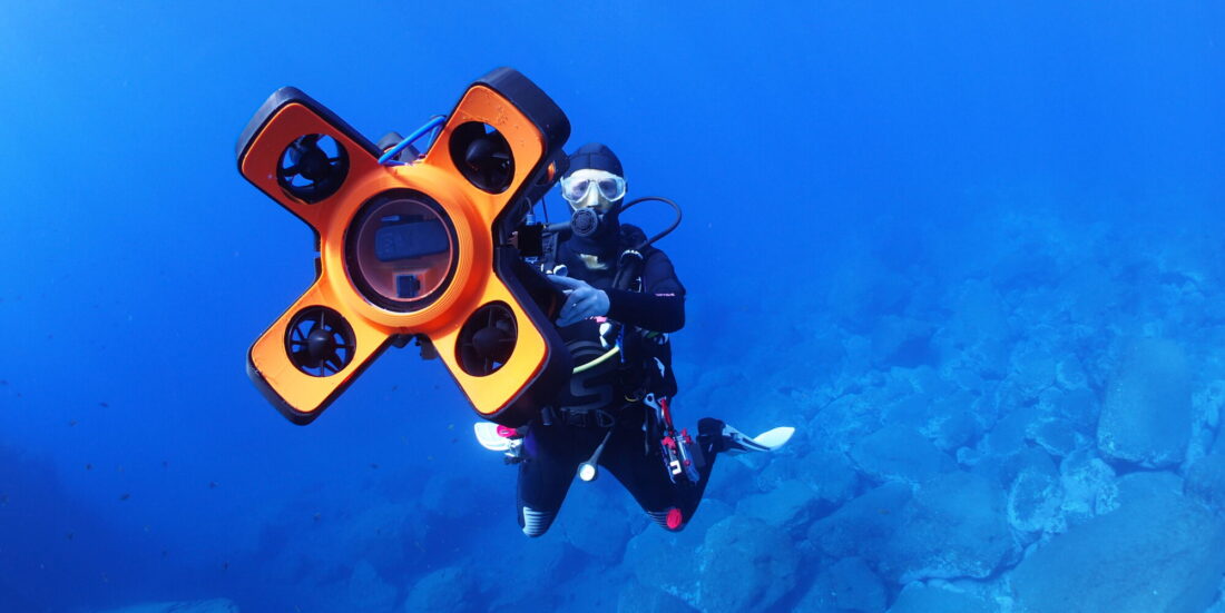 Seabed mapping in practice: A diver deploys a uWare autonomous underwater vehicle in Madeira. Photo: Rodrigo Pires da Silva