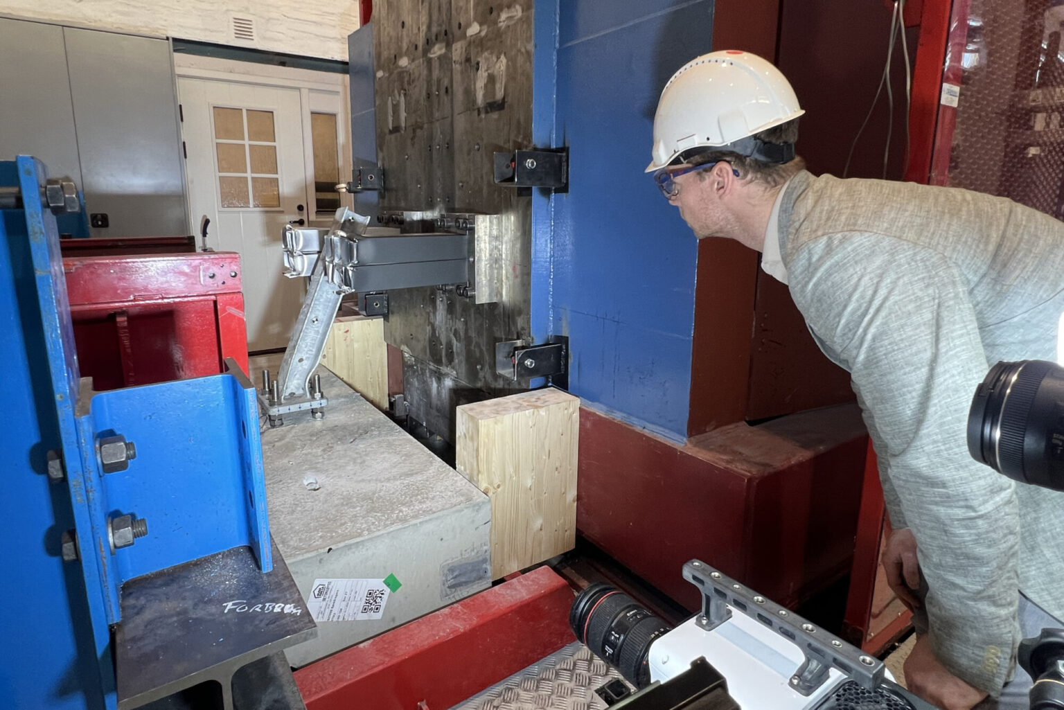 The red rig, known as the Kicking Machine, towers in the test hall, which is one of NTNU’s largest laboratories. It is used to test how materials like aluminium, steel and concrete hold up against extreme loads – such as high-speed collisions.