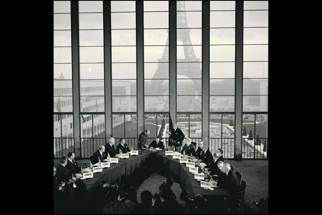 At NATO Headquarters in Paris, Allies sign a document in 1954 inviting West Germany to join the Alliance. The Eiffel Tower is visible in the background. Photo: NATO archives