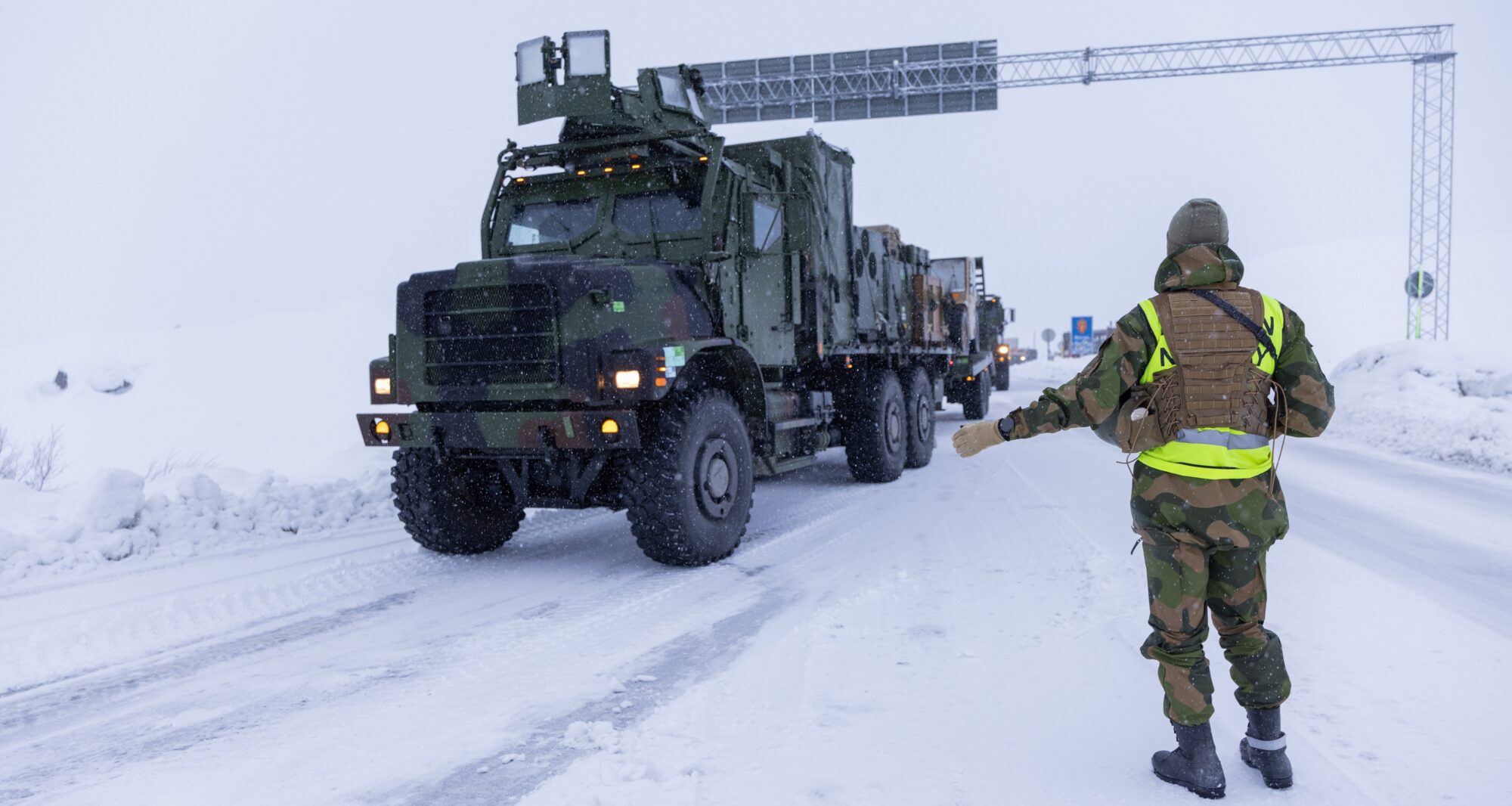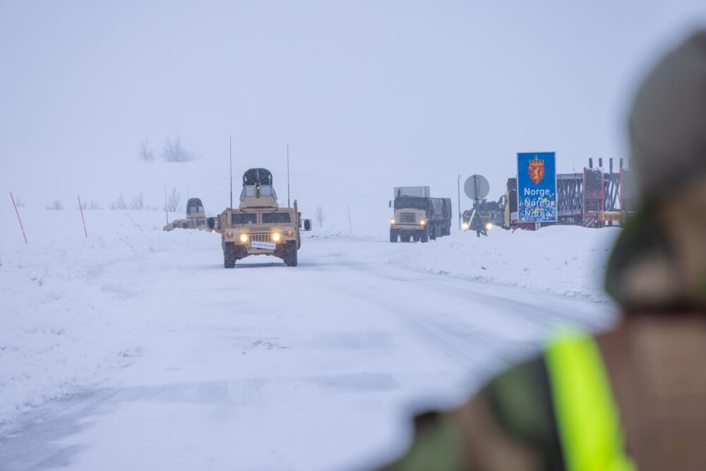 The first vehicle from the United States Marine Corps on its way across the border to Sweden and onward to Finland via Bjørnfjell border station. The Cold Response land exercises are being held in northern Norway and Finland. Photo: Tore Ellingsen / Norwegian Armed Forces