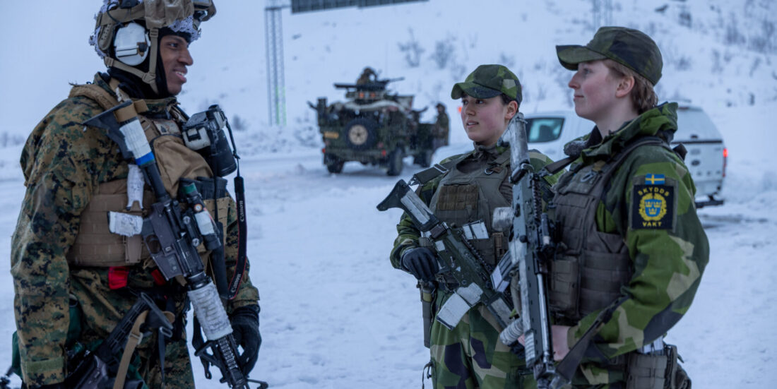 A soldier from the United States Marine Corps talks to soldiers from the Swedish Security Guard during the 2026 Cold Response exercise. Photo: Tore Ellingsen / Norwegian Armed Forces