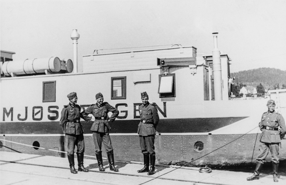 This photograph was taken on 3 August 1940 at Gjøvik pier. The image shows four German soldiers standing on the pier at Gjøvik. From left: Hans Jäger, Ewald, and Berndt v. Tyslka. The ferry Mjøsfærgen I was later used to dump grenades into Lake Mjøsa. Photo: Ewald Schumann, Mjøsmuseet