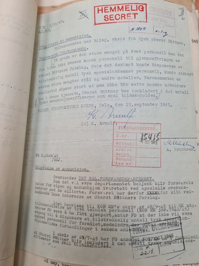 One of the few people who had some sort of overview was Colonel Büttner, who in the summer of 1945 was interned in a prison camp in Lillehammer. In a letter to the Norwegian authorities dated 18 August 1945, he described the situation regarding the ammunition.