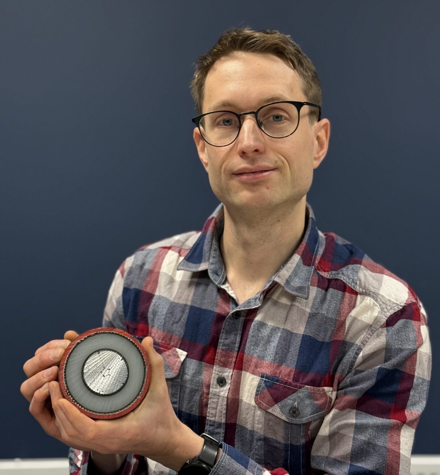 Kristian Solheim Thinn is a research scientist at SINTEF. His expertise is in electrical power supply – more specifically power cables, solar storms and electromagnetic fields. Here he shows the insides of a power cable. Photo: Hege Tunstad